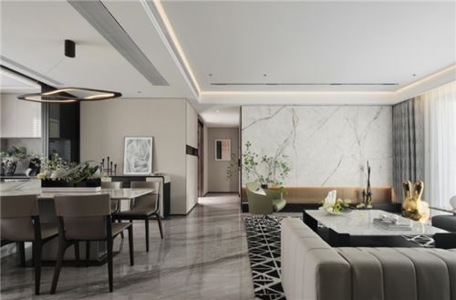 客餐通廳設(shè)計(jì),社交實(shí)力派。洋房戶型客廳+餐廳設(shè)計(jì),開(kāi)闊大氣,盡顯主人會(huì)客尺度。打破空間壁壘,延伸了視覺(jué)的通透性。