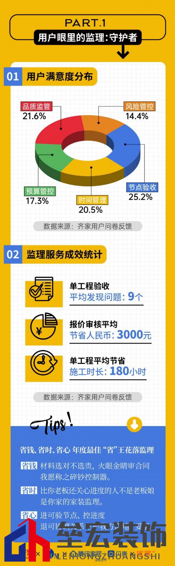 近日,齊家網(wǎng)攜手中國家居建材裝飾協(xié)會及優(yōu)居新聞中心、騰訊家居·貝殼等權(quán)威機構(gòu)聯(lián)合發(fā)布了《一圖了解監(jiān)理人員冷知識,這波全是細節(jié)》(以下簡稱“監(jiān)理報告”)。該報告基于齊家網(wǎng)旗下河貍質(zhì)檢所提供的海量家裝監(jiān)理人員行為數(shù)據(jù)、用戶問卷調(diào)查和權(quán)威第三方大數(shù)據(jù),對家裝監(jiān)理人員的工作狀態(tài)進行全面的分析研究,希望通過數(shù)據(jù)的分析來了解家裝行業(yè)的發(fā)展情況。