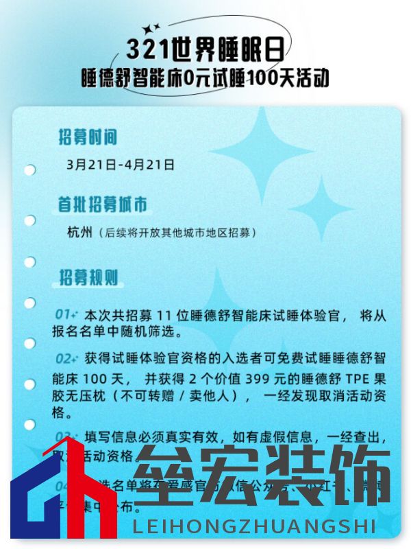 | 2023年3月21日是世界睡眠日,愛感全屋智能家居在杭州正式開啟了為期一個月的試睡官招募活動——免費體驗睡德舒智能床100天! 本次活動旨在幫助更多有睡眠障礙的朋友實現(xiàn)更快速、更健康、更高效的好睡眠,從根本上解決人們的睡眠痛點,改善人們的睡眠習慣和睡眠質(zhì)量,讓大家都擁有一個健康的好身體。