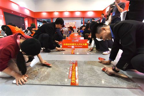 大角鹿展館遵循中國古建筑營造法則,采集經(jīng)典的故宮紅色,融合了簡約而出挑的造型,呈現(xiàn)堂皇端莊、宏偉壯觀的視覺效果。大角鹿本次展會重點展示的柔光磚,獨創(chuàng)“柔光肌膚”國家專利技術(shù),同時運用了“超耐磨鉆石釉”技術(shù),解決了耐磨性和不易清潔的問題,高度迎合了高品質(zhì)家居生活人群的極致追求,吸引眾多領(lǐng)導嘉賓、媒體、消費者、代理商前來參觀,成為晉江陶博會人氣王。 瓷磚好不好,磨磨就知道大角鹿超耐磨萬人pk大賽燃爆晉江