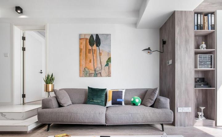 客廳主打簡約的木質(zhì)風(fēng),頂天立地的收納柜,放置書籍與藝術(shù)裝飾品。墻面除了一幅靈動(dòng)的藝術(shù)畫,不再施加粉黛,塑造出一種干凈、清爽的視覺感受。