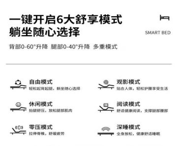 ??功能強(qiáng)大,雖然都是在床上,但不同場(chǎng)景的功能卻大不相同,如何能夠解決多體態(tài)的人體工程學(xué)問(wèn)題,誼瑞推出的六大模式智能體驗(yàn),讓消費(fèi)者在不同場(chǎng)景享受不同貼心服務(wù): ??模式1:休閑模式:抬腿舒壓,放松腿部肌肉; ??模式2:觀影模式:舒緩疲勞,護(hù)腰享生活 ??模式3:閱讀模式:支撐腿部腰部,健康閱讀 ??模式4:零壓模式:腿高心臟,減少脊椎承壓 ??模式5:深睡模式:貼合人七區(qū),延長(zhǎng)深睡時(shí)間 ??模式6:自由模式:輕松起背起腿,躺坐隨心選擇
