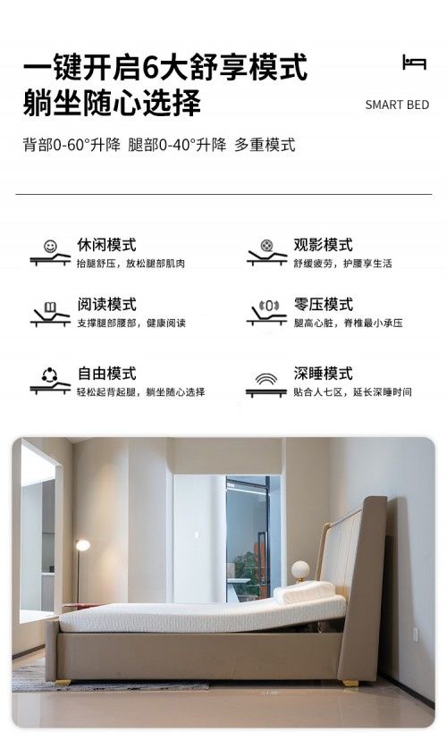 ??推出六大模式智能體驗(yàn),讓消費(fèi)者在不同場(chǎng)景享受不同貼心服務(wù): ??模式1:休閑模式:抬腿舒壓,放松腿部肌肉; ??模式2:觀影模式:舒緩疲勞,護(hù)腰享生活 ??模式3:閱讀模式:支撐腿部腰部,健康閱讀 ??模式4:零壓模式:腿高心臟,減小脊椎承壓 ??模式5:深睡模式:貼合人七區(qū),延長(zhǎng)深睡時(shí)間 ??模式6:自由模式:輕松起背起腿,躺坐隨心選擇