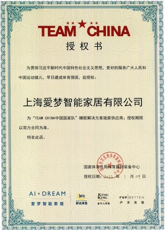 2022年1月24日,愛夢(mèng)集團(tuán)攜旗下Serta舒達(dá)、KINGKOIL金可兒、RUF Betten盧浮百登三大品牌,獲得國(guó)家體育總局體育器材裝備中心授權(quán)許可,正式成為TEAM CHINA中國(guó)國(guó)家隊(duì)睡眠解決方案獨(dú)家供應(yīng)商,為70余支單項(xiàng)國(guó)家隊(duì)隊(duì)伍和運(yùn)動(dòng)員提供智能睡眠寢具、深度睡眠解決方案。
