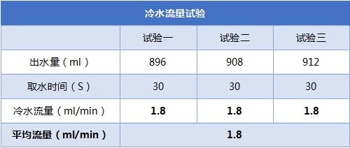 ??通過計(jì)時(shí)30s,對(duì)額定時(shí)長(zhǎng)下冷、熱出水量進(jìn)行計(jì)量測(cè)試,再換算出熱水流量,測(cè)試結(jié)果如下: