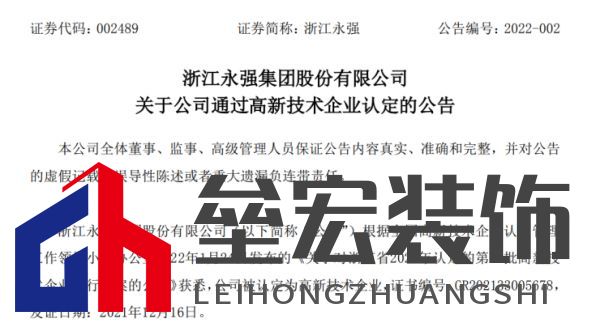 1月26日,浙江永強(qiáng)發(fā)布《關(guān)于公司通過高新技術(shù)企業(yè)認(rèn)定的公告》,稱浙江永強(qiáng)集團(tuán)股份有限公司(以下簡稱“公司”)根據(jù)全國高新技術(shù)企業(yè)認(rèn)定管理 工作領(lǐng)導(dǎo)小組辦公室2022年1月24日發(fā)布的《關(guān)于對(duì)浙江省2021年認(rèn)定的第一批高新技 術(shù)企業(yè)進(jìn)行備案的公告》獲悉,公司被認(rèn)定為高新技術(shù)企業(yè)。 1、證書編號(hào)::GR202133005678 2、發(fā)證日期:2021年12月16日 3、有效期:3年 對(duì)公司的影響: 根據(jù)國家相關(guān)規(guī)定,公司自本次通過高新技術(shù)企業(yè)認(rèn)定后連續(xù)三年(2021年至2023年)可享受國家關(guān)于高新技術(shù)企業(yè)的稅收優(yōu)惠政策,即按15%的稅率繳納企業(yè)所得稅。公司獲得高新技術(shù)企業(yè)認(rèn)定后,原企業(yè)所得稅稅率從25%調(diào)整為15%,對(duì)公司未來年度經(jīng)營狀況將產(chǎn)生積極影響。 四、江山歐派:全資子公司江山花木匠家居有限公司 1月25日,江山歐派發(fā)布《關(guān)于全資子公司通過高新技術(shù)企業(yè)認(rèn)定的公告》。
