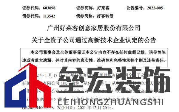 《高新技術(shù)企業(yè)證書》基本情況: 1、證書編號(hào)::GR202133004744 2、發(fā)證日期:2021年12月16日 3、有效期:3年 對(duì)公司的影響: 根據(jù)《中華人民共和國企業(yè)所得稅法》及國家對(duì)高新技術(shù)企業(yè)的相關(guān)規(guī)定,花木匠公司自通過高新技術(shù)企業(yè)認(rèn)定起連續(xù)三年(2021年至2023年)可享受國家關(guān)于高新技術(shù)企業(yè)的稅收優(yōu)惠政策,即按15%的稅率繳納企業(yè)所得稅。 五:好萊客:全資子公司廣州從化好萊客家居有限公司