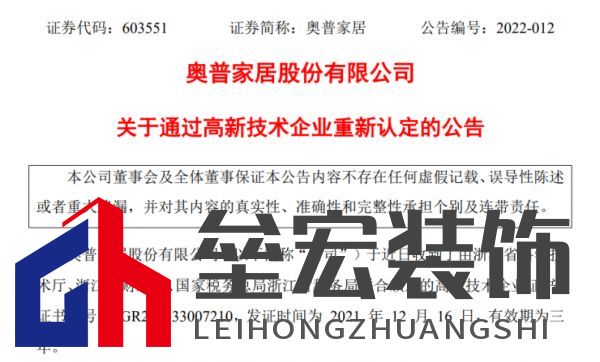 《高新技術(shù)企業(yè)證書》基本情況: 1、證書編號(hào):GR202133002641 2、發(fā)證日期:2021年12月16日 3、有效期:3年 對(duì)公司的影響: 本次高新技術(shù)企業(yè)的認(rèn)定系公司原證書有效期滿后的重新認(rèn)定。根據(jù)《中華人民共和國企業(yè)所得稅法》及國家對(duì)高新技術(shù)企業(yè)的相關(guān)稅收規(guī)定,公司自本次通過高新技術(shù)企業(yè)認(rèn)定后連續(xù)三年(即2021年至2023年)繼續(xù)享受高新技術(shù)企業(yè)的相關(guān)稅收優(yōu)惠政策,按照15%的所得稅率繳納企業(yè)所得稅。 二、奧普家居: 1月27日,奧普發(fā)布《關(guān)于通過高新技術(shù)企業(yè)重新認(rèn)定的公告》。