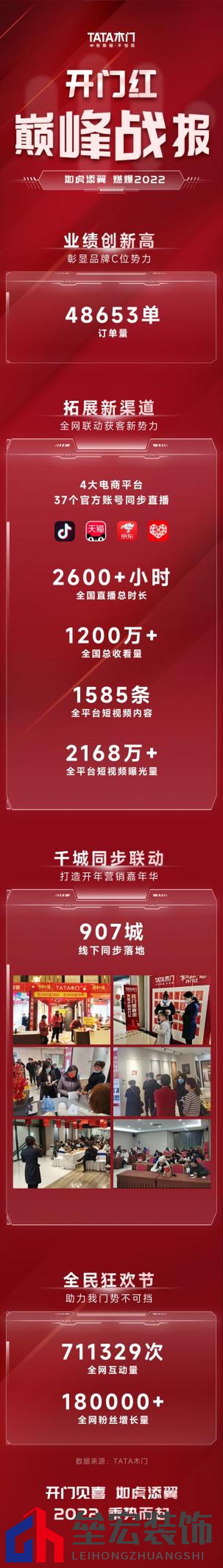 ??用48653單成交轉(zhuǎn)化 給出行業(yè)“開門紅”營(yíng)銷范本 ??直播總時(shí)長(zhǎng)超2600+小時(shí)、全平臺(tái)視頻內(nèi)容1585條、其短視頻曝光量突破2168萬+,總收看量超1200萬人,全網(wǎng)互動(dòng)量711329次、全網(wǎng)粉絲量猛增18萬+,并最終實(shí)現(xiàn)了48653單的成交轉(zhuǎn)化......這一連串的數(shù)據(jù)就是TATA木門在春節(jié)期間啟動(dòng)的開門紅營(yíng)銷的戰(zhàn)報(bào)數(shù)據(jù)。全國(guó)范圍內(nèi)37個(gè)官方賬號(hào)在抖音、天貓、京東和拼多多四大平臺(tái)同步直播聯(lián)動(dòng),TATA木門用一場(chǎng)直播再一次證明了品牌的高度與品牌號(hào)召力。 ??誰能想到,在2021年房地產(chǎn)市場(chǎng)充滿了不確定性的一年中,存量房市場(chǎng)也出現(xiàn)了增速放緩的趨勢(shì),加之原材料價(jià)格上漲、消費(fèi)需求減弱等主客觀因素影響下,無論是大家居行業(yè)或是聚焦于木門行業(yè),都承受著巨大的壓力。然而凡是總有例外,正是在這樣的大環(huán)境下,TATA木門卻用一場(chǎng)漂亮的開門紅進(jìn)一步擴(kuò)大行業(yè)優(yōu)勢(shì),實(shí)現(xiàn)逆勢(shì)增長(zhǎng),為行業(yè)同仁提供了一個(gè)可供參考的“教科書”級(jí)營(yíng)銷范本。 ??在流量為王的時(shí)代下,TATA木門的開門紅數(shù)據(jù)足以令人眼紅,然而能夠取得令業(yè)界為之側(cè)目的成績(jī),TATA木門又有著怎樣的過人之處呢?