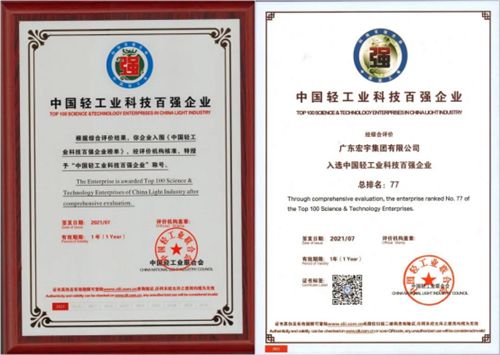 ??宏宇集團(tuán)榮獲“中國輕工業(yè)科技百強(qiáng)企業(yè)”證書