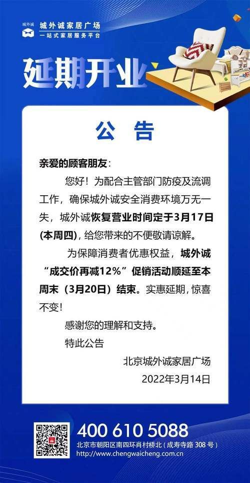 ??新浪家居訊 3月14日,城外誠家居廣場發(fā)布公告稱,為配合主管部門防疫及流調(diào)工作,確保城外誠安全消費環(huán)境萬無一失,商場將于3月17日恢復(fù)營業(yè)。同時表示,“成交價再減12%”促銷活動將順延至3月20日結(jié)束。