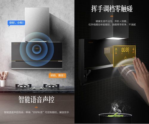 集成灶十大品牌、廚電行業(yè)十大品牌科恩新一代大吸力煙機(jī)7350還擁有智能語音控制與體感操控,呼喚“你好小科”可控制煙機(jī)。