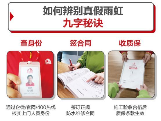 專業(yè)服務+保障 四大承諾打造差異化優(yōu)勢 “房屋漏水,就找雨虹防水維修!”,經(jīng)過20多年的市場教育,東方雨虹在防水領(lǐng)域的專業(yè)性已是眾人皆知。從地面到墻面,從衛(wèi)生間到廚房,東方雨虹在防水維修的產(chǎn)品、技術(shù)、服務上沉淀了豐富的經(jīng)驗。 而在專業(yè)性之外,東方雨虹還向消費者提供了全方位保障。耿剛告訴我們,東方雨虹防水維修服務承諾“材料保國標 工匠嚴篩選 價格全透明 單單有質(zhì)?!?。