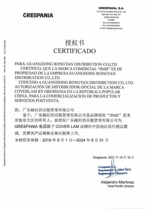 意米巖板,歐洲原裝進(jìn)口,世界潮流同步。自2019年攜手GRESPANIA集團(tuán)以來,步履不停,開拓不止,在強(qiáng)調(diào)產(chǎn)品品質(zhì)與格調(diào)的同時(shí),更注重于健康家居的生活理念,并把品牌的遠(yuǎn)見卓識(shí)與責(zé)任擔(dān)當(dāng)作為我們重要的使命。 戰(zhàn)略授權(quán)書