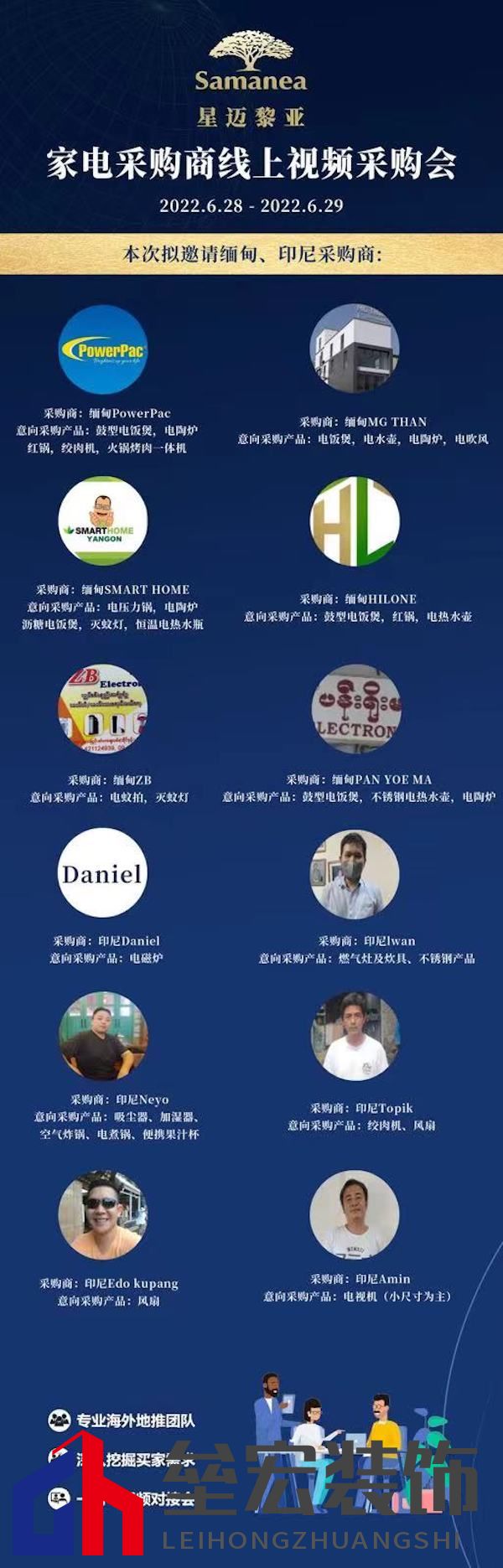 星邁黎亞仰光商貿(mào)城邀請緬甸本土采購商部分名錄 ??此次線上采購會由緬甸、印尼兩地家電代運(yùn)營部組織舉辦,是星邁黎亞為進(jìn)駐商戶提供“代運(yùn)營”服務(wù)的特色活動之一。根據(jù)兩地家電產(chǎn)品的采購需求,星邁黎亞邀約ElectronicCity、Than Htike Electronic、SmartHome、Powerpac等當(dāng)?shù)夭少徤痰脚R商貿(mào)城活動現(xiàn)場,讓緬印采購商與國內(nèi)家電廠商進(jìn)行跨國域的線上需求對接和面對面的視頻洽談。
