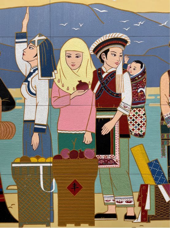 ??本幅作品色彩豐富,原稿針對主畫面人物身上穿著的各式民族服飾使用了不同的色塊進行區(qū)分,而在馬可波羅文化陶瓷上,工藝師加上了不同的刀法來展示,讓作品層次更加豐富。背景中的海鷗,還采用了陰陽刻相結(jié)合的手法,近距離觀看藝術(shù)壁畫的細節(jié),更能感受到手工雕刻精細而傳神的魅力。