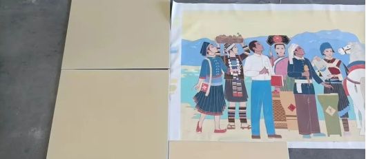 ??精益求精 于細節(jié)處顯匠心 ??要在地鐵站中應(yīng)用文化陶瓷,既需要滿足施工時對于安全的性能要求,也要滿足能夠完美重現(xiàn)作品的藝術(shù)表現(xiàn)力。 ??為此,馬可波羅文化陶瓷特別定制了一款600×1200mm 的黃色面釉磚作為作品平面的底色,既符合原作的色系,又豐富了顏色的層次,讓作品既有平面釉色,又有雕刻后繪制的其他顏色。