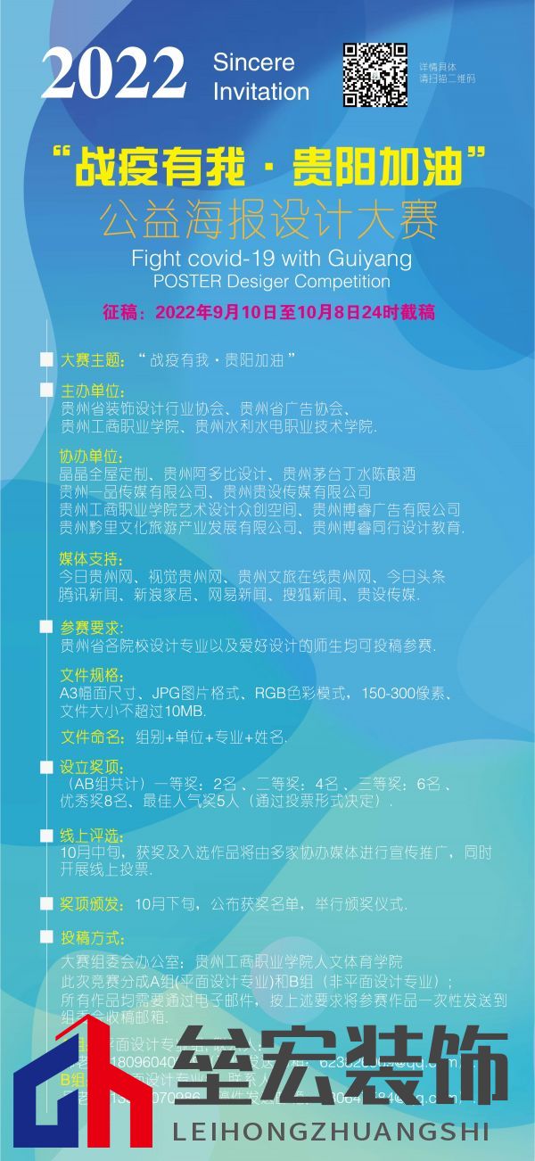 戰(zhàn)疫有我、貴陽加油 (可圍繞貴陽抗疫自擬主題) 03 組織機(jī)構(gòu) 主辦單位 貴州省裝飾設(shè)計(jì)行業(yè)協(xié)會 貴州省廣告協(xié)會 貴州工商職業(yè)學(xué)院 貴州水利水電職業(yè)技術(shù)學(xué)院 協(xié)辦單位 晶晶全屋定制 貴州阿多比設(shè)計(jì) 貴州貴設(shè)傳媒有限公司 貴州一品傳媒有限公司 貴州茅臺丁水陳釀酒 貴州工商職業(yè)學(xué)院藝術(shù)設(shè)計(jì)眾創(chuàng)空間 貴州黔里文化旅游產(chǎn)業(yè)發(fā)展有限公司 貴州博睿同行設(shè)計(jì)教育 貴州博睿廣告有限公司 04 媒體支持 今日貴州網(wǎng) 視覺貴州網(wǎng) 貴州文旅在線貴州網(wǎng) 今日頭條 騰訊新聞 新浪家居 網(wǎng)易新聞 搜狐新聞 貴設(shè)傳媒 05 參賽對象 貴州省各院校設(shè)計(jì)專業(yè)以及愛好設(shè)計(jì)的師生均可投稿參賽。 06 參賽要求 (一)參賽作品可以繪畫、插畫設(shè)計(jì)、廣告設(shè)計(jì)等方式呈現(xiàn)。力求主題鮮明,感染力強(qiáng),有利于擴(kuò)大疫情宣傳的力度,增加群眾自我防護(hù)意識,提升社會對戰(zhàn)勝疫情的信心,推動全國疫情防控工作。(二)設(shè)計(jì)關(guān)鍵詞:貴陽加油、萬眾一心、眾志成城、責(zé)任、生命、使命、愛心、決心、信心……(三)作品內(nèi)容需要積極向上傳遞正能量,內(nèi)容新穎突出創(chuàng)意、具有較強(qiáng)視覺沖擊力。(四)參賽作品一律提交電子稿件,文件規(guī)格:JPG圖片格式,RGB色彩模式,精度150-300dpi,每張圖片的尺寸為A3幅面,圖片大小不超過10MB,圖片文件命名為:組別+單位名稱+專業(yè)+姓名,純手繪作品可掃描后按照上述格式提交電子稿件。(五)每位作者需以Word文檔的形式,填寫一份《參賽登記表》,與參賽作品打包提交,表格模板已附在文件最后。 (六)參賽作者需保留參賽作品的位圖原文件或矢量文件,如獲獎、入選后需提供給主辦單位用于線下展覽及相關(guān)活動宣傳。 07 參賽方式 此次競賽分成A組(平面設(shè)計(jì)專業(yè))和B組(非平面設(shè)計(jì)專業(yè))。所有作品均需要通過電子郵件,按上述要求將參賽作品一次性發(fā)送到組委會收稿郵箱。 A組:平面設(shè)計(jì)專業(yè)組(發(fā)送郵箱:623826969@qq.com); B組:非平面設(shè)計(jì)專業(yè)組(發(fā)送郵箱:530647584@qq.com); 08 大賽進(jìn)程