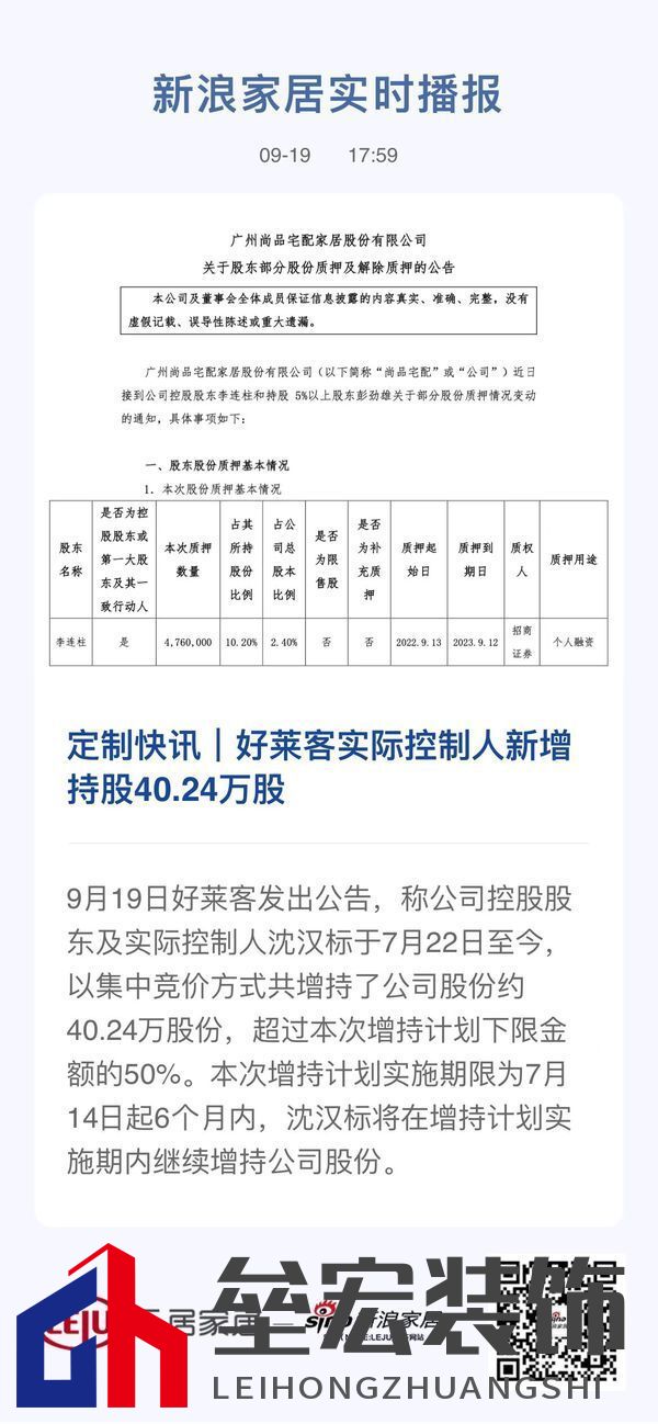 ??新浪定制頻道訊9月19日好萊客發(fā)出公告,稱公司控股股東及實(shí)際控制人沈漢標(biāo)于7月22日至今,以集中競(jìng)價(jià)方式共增持了公司股份約40.24萬股份,超過本次增持計(jì)劃下限金額的50%。本次增持計(jì)劃實(shí)施期限為7月14日起6個(gè)月內(nèi),沈漢標(biāo)將在增持計(jì)劃實(shí)施期內(nèi)繼續(xù)增持公司股份。