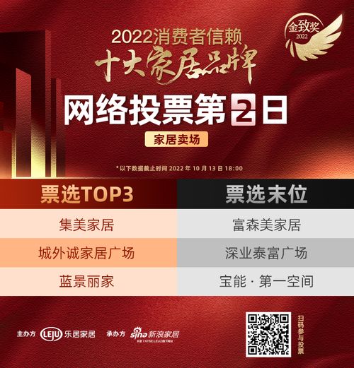 | 由樂居家居主辦,新浪家居承辦;CCTV《大國品牌》、家頁、家居質(zhì)量研究院、大國中居聯(lián)合主辦;全國工商聯(lián)家具裝飾業(yè)商會、中國建筑材料流通協(xié)會共同指導;樂騰商學院、家頁智庫、家居質(zhì)量研究院提供研究支持。9月16日,第三屆《尋找優(yōu)質(zhì)消費者品牌--2022消費者信賴十大家居品牌》正式啟動。經(jīng)過企業(yè)申報、候選品牌公示環(huán)節(jié)后,于10月12日正式進入投票環(huán)節(jié)。>>點擊為家居賣場品牌投票 家居賣場第二日戰(zhàn)報如下