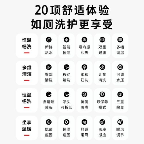 除了深度除臭需求,面對不同家庭成員的其他不同需求,“除臭卷王”配置了20多項完備的功能應對,例如老年人如廁后擦拭難,擦拭不干凈引發(fā)的一系列健康問題,“除臭卷王”對應擁有落座感應、兩重過濾新鮮活水、自潔抗菌噴嘴等高科技功能,操作簡單易學,比較人性化。