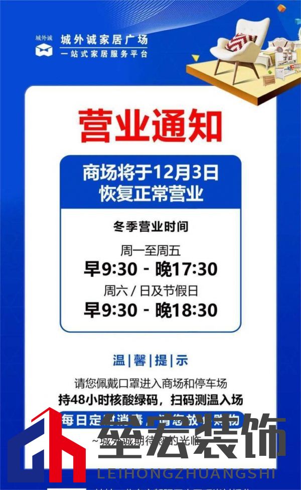 | 近期,北京多家商場(chǎng)陸續(xù)恢復(fù)營(yíng)業(yè)。12月2日,北京集美家居、城外誠(chéng)家居兩大家居賣(mài)場(chǎng)發(fā)布營(yíng)業(yè)通知。北京城外誠(chéng)家居廣發(fā)通知,城外誠(chéng)商場(chǎng)于12月3日(今日)恢復(fù)正常營(yíng)業(yè),消息顯示,城外誠(chéng)冬季營(yíng)業(yè)時(shí)間為周一至周五9時(shí)30分-17時(shí)30分,周六/日及節(jié)假日為9時(shí)30分-18時(shí)30分;同日集美家居發(fā)布消息稱(chēng),集美家居北京各商場(chǎng)于12月3日恢復(fù)正常營(yíng)業(yè),營(yíng)業(yè)時(shí)間為周一至周五9時(shí)30分-17時(shí)30分,周六/日及節(jié)假日9時(shí)30分-18時(shí)30分。商場(chǎng)提示消費(fèi)者佩戴口罩進(jìn)入商場(chǎng)和停車(chē)場(chǎng),持48小時(shí)核酸綠碼,掃碼測(cè)溫入場(chǎng)。   |