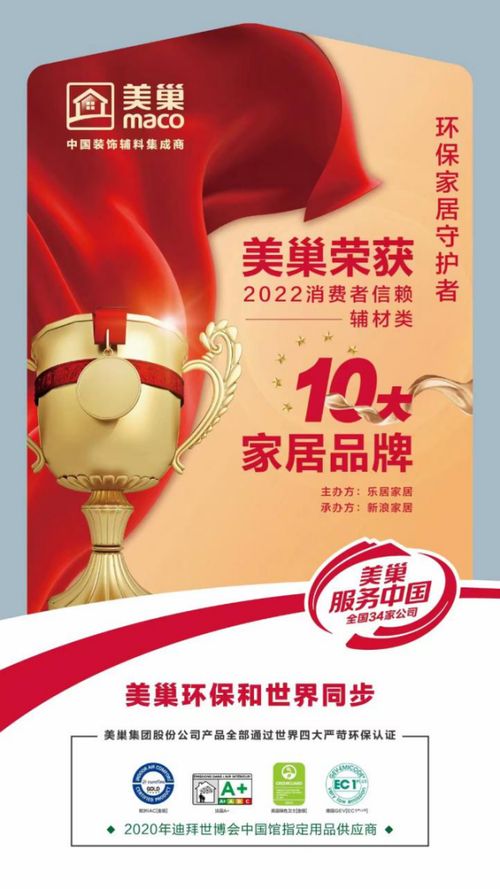 ??“2022消費(fèi)者信賴十大家居品牌”評(píng)選活動(dòng)由樂居家居主辦,新浪家居承辦,CCTV《大國品牌》、家頁、家居質(zhì)量研究院、大國中居聯(lián)合主辦。本次評(píng)選活動(dòng)以“家居行業(yè)高質(zhì)量發(fā)展,扎實(shí)推進(jìn)優(yōu)質(zhì)品牌建設(shè)”為宗旨,通過對(duì)產(chǎn)品品質(zhì)、服務(wù)質(zhì)量、消費(fèi)口碑、品牌影響力四大維度綜合評(píng)審。美巢憑借世界水平的環(huán)保產(chǎn)品、美巢服務(wù)中國的市場布局、良好的消費(fèi)者口碑及深耕多年的品牌影響力榮登“2022消費(fèi)者信賴十大家居品牌”輔材類榜單。 ??環(huán)保家居守護(hù)者,美巢環(huán)保和世界同步 ??作為消費(fèi)者信賴十大家居品牌,美巢成立26年以來始終專注、專業(yè)于室內(nèi)環(huán)保裝飾輔料的研究、開發(fā)和制造。室內(nèi)裝飾與生命零距離,美巢有責(zé)任給消費(fèi)者一個(gè)鄭重承諾——“美巢環(huán)保和世界同步”。美巢集團(tuán)股份公司產(chǎn)品全部通過了世界四大環(huán)保認(rèn)證:美國UL GREENGUARD綠色衛(wèi)士[金級(jí)]認(rèn)證、德國GEV EMICODE EC1PLUS認(rèn)證、歐洲歐陸IAC金級(jí)認(rèn)證、法國French A+級(jí)標(biāo)準(zhǔn)。憑借著世界水平的環(huán)保產(chǎn)品被授牌成為2020年迪拜世博會(huì)中國館指定用品供應(yīng)商。