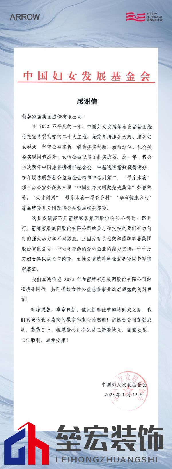 | 踐行社會(huì)責(zé)任,打造「箭牌澤計(jì)劃」回饋社會(huì) 據(jù)世界氣象組織在2022年底發(fā)布的首份《全球水資源狀況報(bào)告》,目前全球有36億人每年至少有一個(gè)月面臨供水不足,預(yù)計(jì)到2050年這一數(shù)字還將增至50億以上。 當(dāng)影響國計(jì)民生、關(guān)乎人類生存發(fā)展的水資源問題愈加嚴(yán)峻,越來越多來自社會(huì)各界的群體、組織開始投身其中,探尋解決之道,逐漸凝成了獨(dú)特的公益力量。而箭牌家居集團(tuán)打造的公益品牌-「箭牌澤計(jì)劃」正是以回饋社會(huì)為己任,努力踐行社會(huì)責(zé)任。  誕生自2022年的「箭牌澤計(jì)劃」延續(xù)了箭牌家居的基因,通過創(chuàng)新化的探索,挖掘出品牌公益道路的新模式:以衛(wèi)生和環(huán)保為抓手,凝聚各方細(xì)水長流的公益力量,以產(chǎn)品、活動(dòng)、資金等多種形式將關(guān)愛輻射至多個(gè)群體,并配合品牌科技驅(qū)動(dòng)打造“可持續(xù)的生活解決方案”。這其中便涵蓋對(duì)“水”公益的落地行動(dòng)。 秉承著讓水資源短缺地區(qū)的孩子也可以實(shí)現(xiàn)熱水澡自由的信念,2022年8月,箭牌家居聯(lián)合廣東省婦女兒童基金會(huì),以現(xiàn)金捐贈(zèng)的形式助力內(nèi)蒙古正藍(lán)旗那日?qǐng)D蘇木烏日?qǐng)D嘎查“母親水窖——集中供水工程”援建項(xiàng)目,幫助偏遠(yuǎn)干旱地區(qū)婦女和群眾解決飲水困難的問題,在整個(gè)過程中倡導(dǎo)全社會(huì)踐行節(jié)水行為、實(shí)現(xiàn)更為環(huán)保的生活方式,內(nèi)蒙古“母親水窖”項(xiàng)目成為中國缺水地區(qū)萬千家庭生活的希望與幸福源泉。 在傳遞善意的道路上,點(diǎn)滴付出亦會(huì)被看見。近日,箭牌家居「箭牌澤計(jì)劃」對(duì)“母親水窖——集中供水工程”援建項(xiàng)目的公益行動(dòng)收到了中國婦女發(fā)展基金會(huì)的感恩回饋。一封誠摯的感謝信,道盡中國婦女發(fā)展基金會(huì)與箭牌家居戮力同心、持續(xù)發(fā)力女性公益事業(yè)的初心。  用品牌力量發(fā)起公益號(hào)召,做有溫度有擔(dān)當(dāng)?shù)钠髽I(yè) 事實(shí)上,箭牌家居一直走在社會(huì)公益的道路上,踐行著企業(yè)應(yīng)有的社會(huì)責(zé)任。2021年-2022年期間,箭牌家居曾聯(lián)合香江社會(huì)救助基金會(huì),援建重點(diǎn)貧困地區(qū)學(xué)校,陸續(xù)為湖南、廣東內(nèi)十所在建小學(xué)捐贈(zèng)衛(wèi)生間瓷磚、坐便器、蹲便器、立柱盆、龍頭等潔具產(chǎn)品,幫助當(dāng)?shù)馗纳平逃h(huán)境,提升相關(guān)衛(wèi)生體驗(yàn)標(biāo)準(zhǔn)和兒童衛(wèi)生常識(shí);還攜手廣東省婦女兒童基金會(huì),聚焦對(duì)特殊母親及其家庭的關(guān)懷和扶持,為50個(gè)特殊家庭提供潔具產(chǎn)品,幫助特殊家庭解決健康生活的難題;此外,2022年年末,箭牌家居更是將公益的核心聚焦老年人群體,聯(lián)合天貓、中國老年學(xué)會(huì)和老年醫(yī)學(xué)學(xué)會(huì)共同發(fā)起“黃扶手計(jì)劃”,向社會(huì)送出5萬個(gè)適老扶手,為老年人群體送去精神和生活的支柱。  于無聲處傳遞愛意,于細(xì)節(jié)處貼心守護(hù)。相信未來,箭牌家居將持續(xù)公益之路,通過「箭牌澤計(jì)劃」讓善意觸達(dá)更廣泛的群體,用品牌的力量發(fā)起全社會(huì)的公益號(hào)召,做有溫度有擔(dān)當(dāng)?shù)钠髽I(yè)。