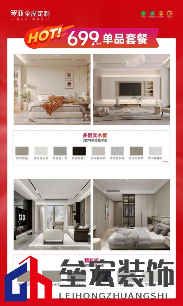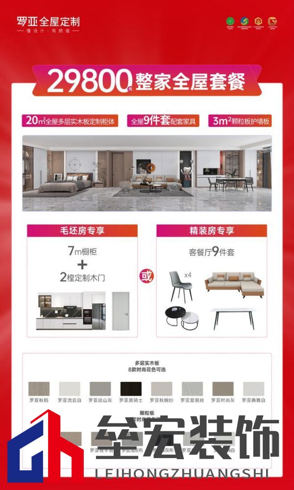 29800元整家全屋套餐,毛坯/精裝一口價(jià)配齊 相比于市場(chǎng)上同類套餐,購(gòu)買羅亞全屋定制柜/護(hù)墻板/定制木門,實(shí)現(xiàn)流行的柜墻門一體化設(shè)計(jì),僅需29800元一價(jià)配齊,極具“質(zhì)價(jià)比+心價(jià)比”優(yōu)勢(shì);同時(shí),柜墻門一體化搭配,無需操勞奔波建材市場(chǎng)每家比較,也不用擔(dān)心花色、風(fēng)格、售后服務(wù)沖突等一系列煩事,省時(shí)又省心。此外,該套餐分別針對(duì)毛坯房和精裝房,配置了不同的套餐內(nèi)容。 29800元整家全屋套餐=20㎡全屋多層實(shí)木板定制柜體+3㎡顆粒板護(hù)墻板+7m櫥柜+2樘定制木門(毛坯房專享)或20㎡全屋多層實(shí)木板定制柜體+3㎡顆粒板護(hù)墻板+客餐廳9件套(精裝房專享),一個(gè)套餐就能將柜、墻、門等產(chǎn)品一站配齊,真正實(shí)現(xiàn)“一家搞定,一價(jià)配齊,一體設(shè)計(jì)”。