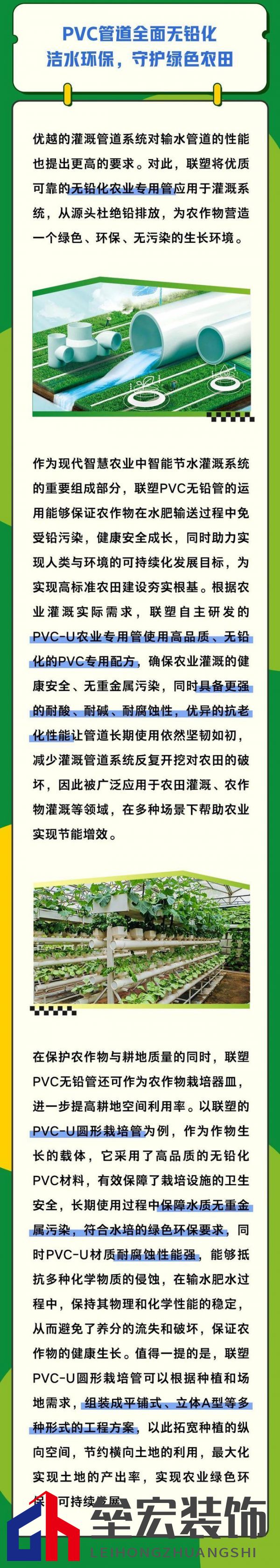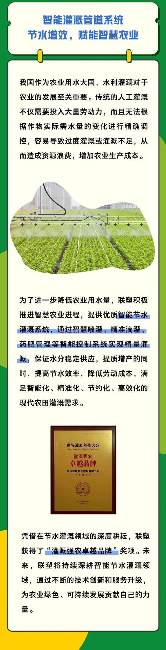 憑借在節(jié)水灌溉領域的深度耕耘,聯(lián)塑獲得了“灌溉強農(nóng)卓越品牌”獎項。未來,聯(lián)塑將持續(xù)深耕智能節(jié)水灌溉領域,通過不斷的技術創(chuàng)新和服務升級為農(nóng)業(yè)綠色、可持續(xù)發(fā)展貢獻自己的力量。 潔水環(huán)保,守護綠色農(nóng)田 優(yōu)越的灌溉管道系統(tǒng)對輸水管道的性能也提出更高的要求。對此,聯(lián)塑將優(yōu)質可靠的無鉛化農(nóng)業(yè)專用管應用于灌溉系統(tǒng),從源頭杜絕鉛排放,為農(nóng)作物營造一個綠色、環(huán)保、無污染的生長環(huán)境。 作為現(xiàn)代智慧農(nóng)業(yè)中智能節(jié)水灌溉系統(tǒng)的重要組成部分,聯(lián)塑PVC無鉛管的運用能夠保證農(nóng)作物在水肥輸送過程中免受鉛污染,健康安全成長,同時助力實現(xiàn)人類與環(huán)境的可持續(xù)化發(fā)展目標,為實現(xiàn)高標準農(nóng)田建設夯實根基。根據(jù)農(nóng)業(yè)灌溉實際需求,聯(lián)塑自主研發(fā)的PVC-U農(nóng)業(yè)專用管使用高品質、無鉛化的PVC專用配方,確保農(nóng)業(yè)灌溉的健康安全、無重金屬污染,同時具備更強的耐酸、耐堿、耐腐蝕性,優(yōu)異的抗老化性能讓管道長期使用依然堅韌如初減少灌溉管道系統(tǒng)反復開挖對農(nóng)田的破壞,因此被廣泛應用于農(nóng)田灌溉、農(nóng)作物灌溉等領域,在多種場景下幫助農(nóng)業(yè)實現(xiàn)節(jié)能增效。