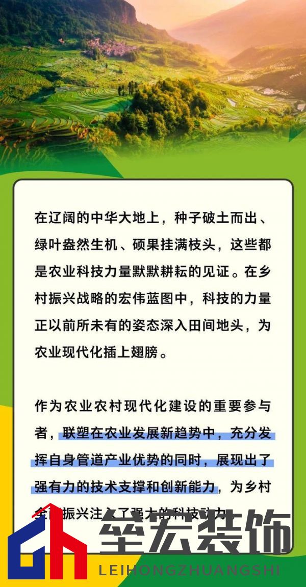 | 在遼闊的中華大地上,種子破土而出、綠葉盎然生機、碩果掛滿枝頭,這些都是農(nóng)業(yè)科技力量默默耕耘的見證。在鄉(xiāng)村振興戰(zhàn)略的宏偉藍圖中,科技的力量正以前所未有的姿態(tài)深入田間地頭,為農(nóng)業(yè)現(xiàn)代化插上翅膀。 作為農(nóng)業(yè)農(nóng)村現(xiàn)代化建設的重要參與者,聯(lián)塑在農(nóng)業(yè)發(fā)展新趨勢中,充分發(fā)揮自身管道產(chǎn)業(yè)優(yōu)勢的同時,展現(xiàn)出了強有力的技術支撐和創(chuàng)新能力,為鄉(xiāng)村全面振興注入了強大的科技動力。