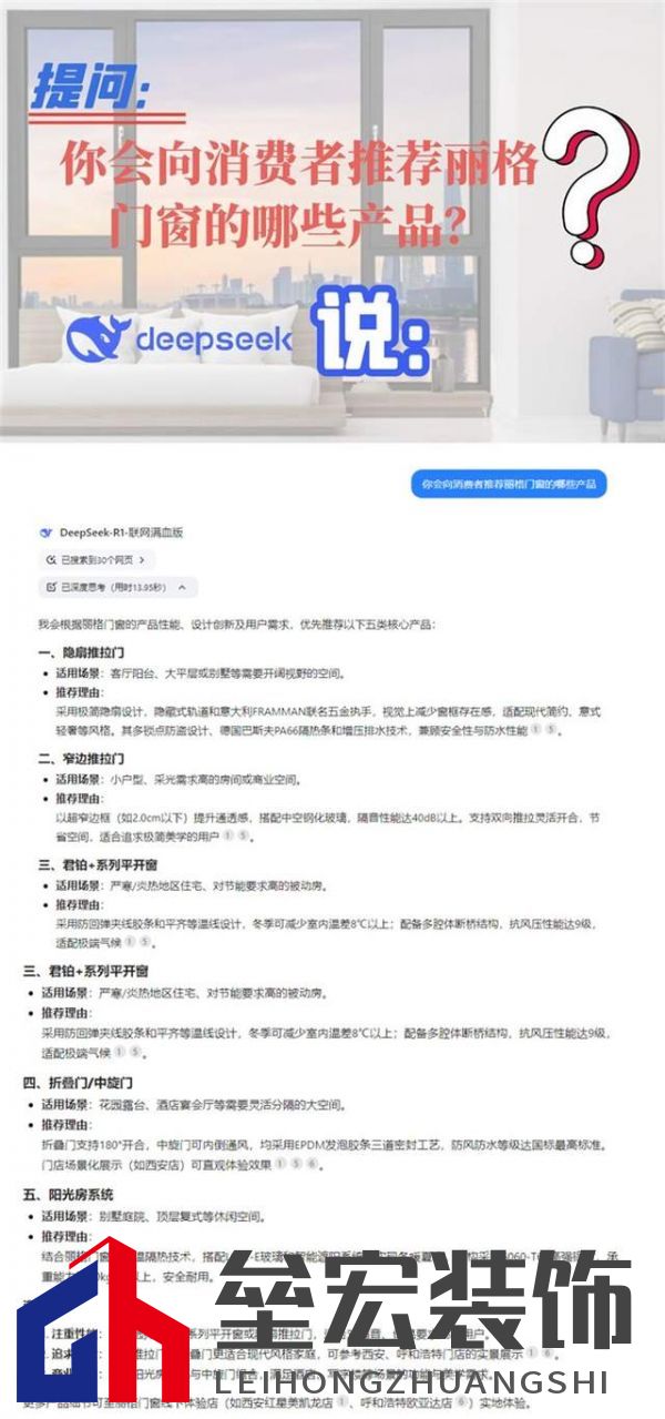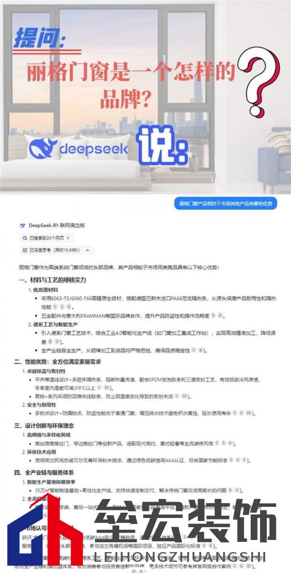 ??DeepSeek,這位AI界的佼佼者,以其強(qiáng)大的自然語言處理能力和深厚的算法基礎(chǔ),正逐步改變著人們的生活方式。它不僅能夠?yàn)橛脩籼峁┚珳?zhǔn)的信息查詢和高效的輔助學(xué)習(xí),更因其對中國本土語境的深刻理解,成為了無數(shù)人心中的智能伙伴。 ??那么,DeepSeek,這位 AI 領(lǐng)域的佼佼者,會以怎樣的視角審視麗格門窗?又會如何對麗格門窗的獨(dú)特魅力進(jìn)行深度解析?