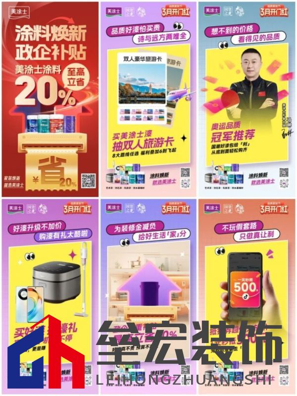 ??01 ??品質(zhì)家裝 盛況空前 ??全域營銷引爆品牌聲量 ??三月作為裝修黃金期,其適宜的氣候為施工提供了優(yōu)越的環(huán)境,是“金三銀四”的開工旺季。與此同時,正值各地新一年“以舊換新”政策密集落地,消費旺季與政策利好的雙重疊加,無論是對新房裝修還是舊房翻新的家裝用戶來說,都是不容錯過的裝修好時節(jié)。 ??作為民族涂料大國品牌,美涂士深度聚焦消費者需求,與國家政策同頻共振,3月品質(zhì)家裝節(jié),美涂士通過政企雙重補(bǔ)貼讓利,積極響應(yīng)國家“以舊換新”政策,至高立省20%的優(yōu)惠力度,讓消費者能以更實在的價格享受到更高品質(zhì)的國潮涂料產(chǎn)品,進(jìn)一步降低用戶的家裝成本。同時活動推出“買美涂士漆送旅游,8大旅游路線任選”、“藝術(shù)漆、仿石漆、乳膠漆、防水基輔材全品類產(chǎn)品通用優(yōu)惠券”、“壕禮抽獎直播之夜”等創(chuàng)新營銷方式,讓用戶在煥新美家的同時,還能享受一場說走就走的旅行,實現(xiàn)生活品質(zhì)與幸福感的雙重提升,真正做到為用戶創(chuàng)造美好生活!