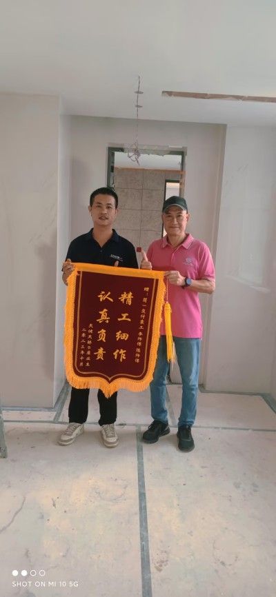 ??盛夏的工地沒有空調(diào),汗水順著額角淌進眼睛里,他抹把臉繼續(xù)校準(zhǔn)瓷磚,手指不停在磚邊比畫,就怕一刀下去破壞了紋路的流暢;寒冬的風(fēng)裹著冷氣往骨頭里鉆,指尖凍得發(fā)僵,他就往手心哈口熱氣搓搓,再繼續(xù)貼著磚邊找角度,哪怕膝蓋抵著冰冷的地面麻了半邊腿,也得等確認(rèn)切口和原磚嚴(yán)絲合縫才肯起身。 ??這些藏在寒暑里的堅持,讓他通過手里的磚片,把“切磚如原磚”的細致,刻進了深圳深鐵懿府、臨海攬山、香蜜湖熙園這些深圳高端住宅的角落里。而這樣的細致,陪著他鋪妥了300多個家的瓷磚,從未打折扣。 ??簡一5A空間交付:只為那份妥帖和心安 ??有人問他:“干這么多年,哪一刻最有成就感?”陳偉超笑了:“前陣子在香蜜湖別墅,業(yè)主看完非常滿意,當(dāng)場說‘這項目的其他地方也給你們做’?!?/p> ??這份信任,源于他對工藝精度的執(zhí)著打磨,簡一今年全新升級「5A精工薄貼」工藝后,他貼的磚縫能控制在0.2毫米以內(nèi)——比半根頭發(fā)絲還細,站在遠處看,墻/地面像一整塊渾然天成的石材,紋理順著墻/地面自然延伸,業(yè)主驗收時湊近了才發(fā)現(xiàn)“原來有縫”。 ??這一面面由業(yè)主親手送上的錦旗,便是對陳偉超匠心最生動的認(rèn)證:深圳星河丹堤李小姐送來的“手藝精湛 完美呈現(xiàn) 服務(wù)周到 盡心盡責(zé)”,16個金光大字里,仿佛能看見他為調(diào)順一道紋理,蹲在地上半天不動直到腿麻的執(zhí)著,也能想起他一次次停下手中活計,耐心解答業(yè)主疑問時眼里的真誠;